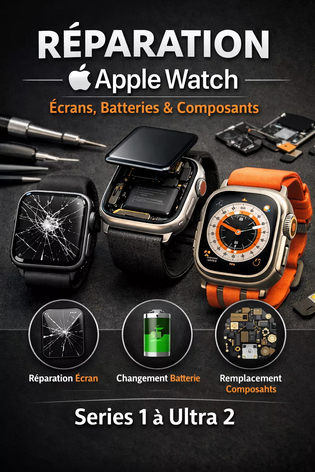 Service de réparation Apple Watch toutes séries : remplacement écran, batterie, Digital Crown, boutons, haut-parleur, micro, capteurs et autres pannes courantes.